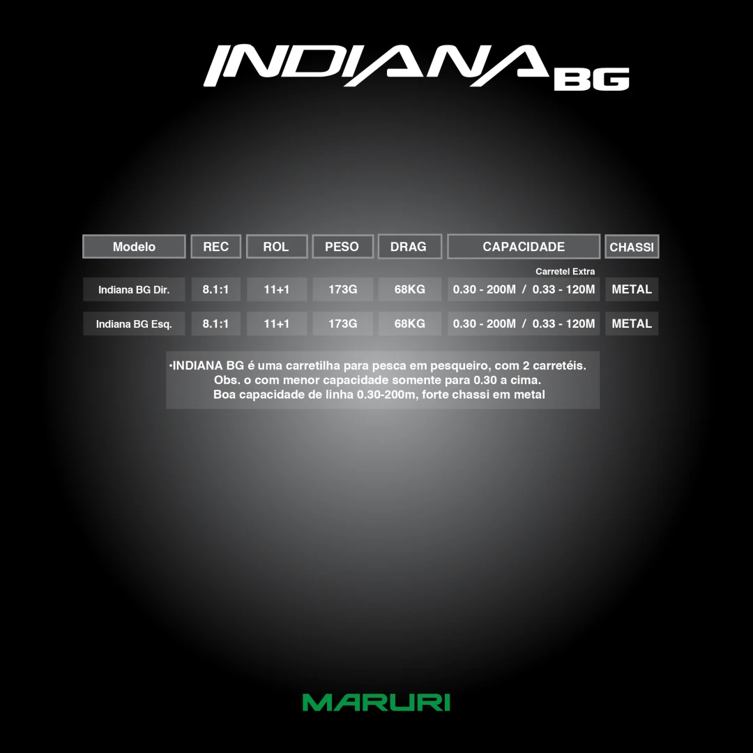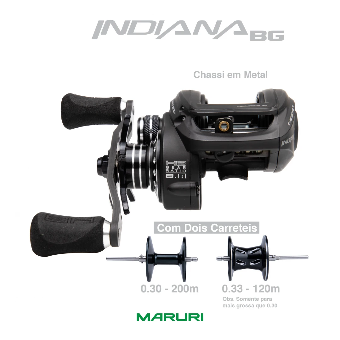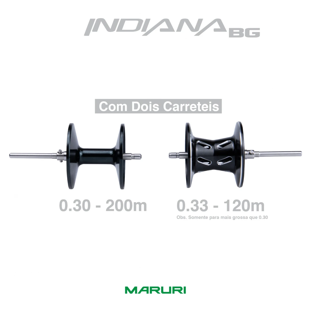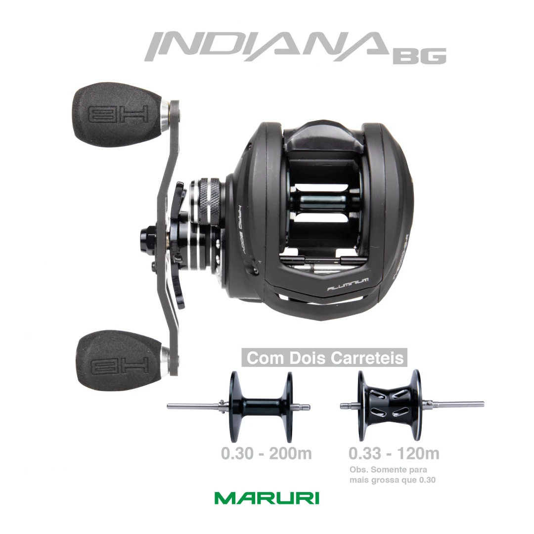 INDIANA BG é uma carretilha para pesca em pesqueiro, com 2 carretéis. Obs. o com menor capacidade somente para 0.30 a cima.
