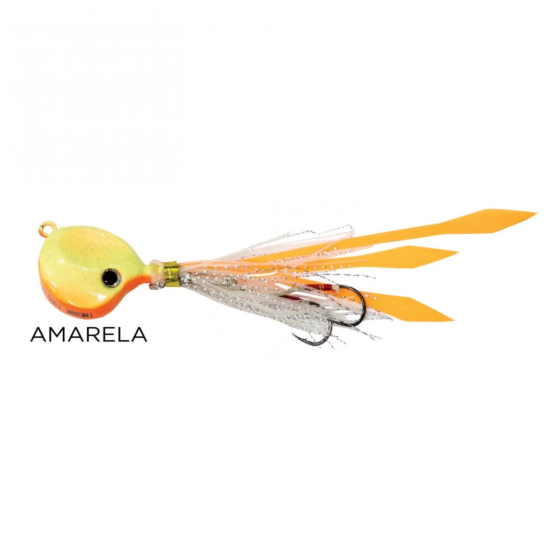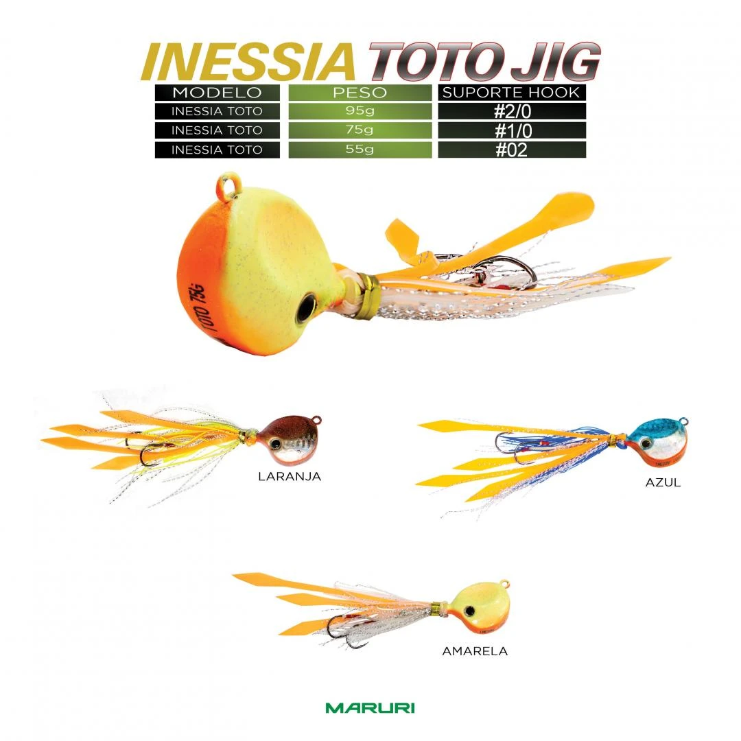 Inessi Toto 55, 75 e 95g é um jumping jig perfeito para a pesca de Olhetes, Olhos de Boi, etc. Com toda certeza o modelo de jig mais vendido no Brasil, pois sua eficiência é impressionante. Os predadores não resistem!