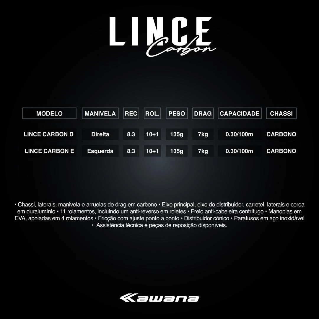 Nova Carretilha Lince Carbon – Chassi Reforçado, desenvolvida com os materiais e tecnologias mais avançados, é uma verdadeira obra-prima de engenharia. Compacta e leve, ela apresenta um design excepcional e um freio anti-cabeleira inovador, aliado a um drag robusto e eficaz. Com um recolhimento rápido de 8.3, recupera 80 cm de linha a cada giro da manivela.