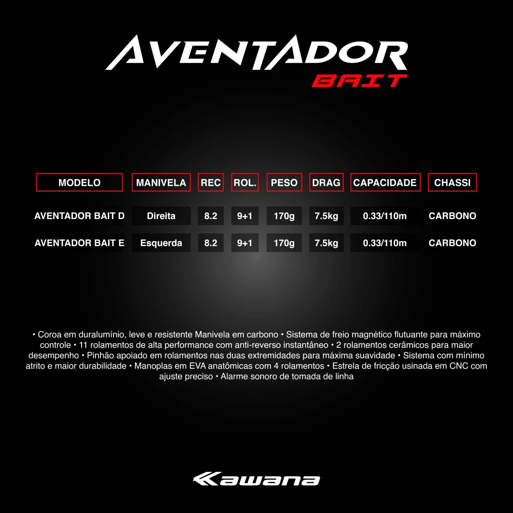 A Aventador BAIT ideal para arremessos de iscas artifiaiss. Possui sistema anti‑cabeleira de freio flutuante, que ajusta automaticamente conforme a necessidade e o giro do carretel, com regulagem externa ponto a ponto. Todas as fixações são em parafusos de aço inox, oferecendo resistência à prova d’água. Suporte técnico e peças de reposição disponíveis.