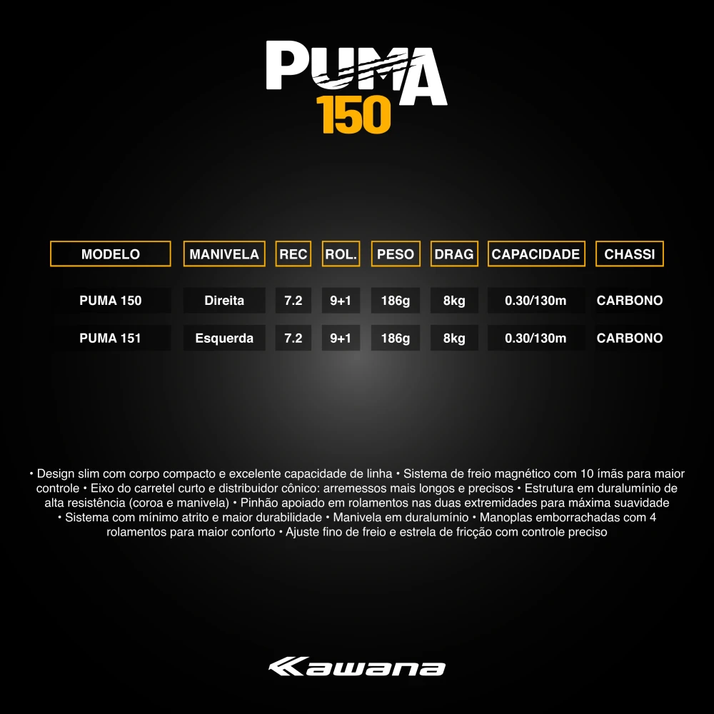 A carretilha PUMA 150/151 foi projetada para pesca de traíra e outras espécies que exigem maior força de tração. Com velocidade de recolhimento média e coroa com menos dentes, porém maiores, prioriza robustez e alto desempenho.