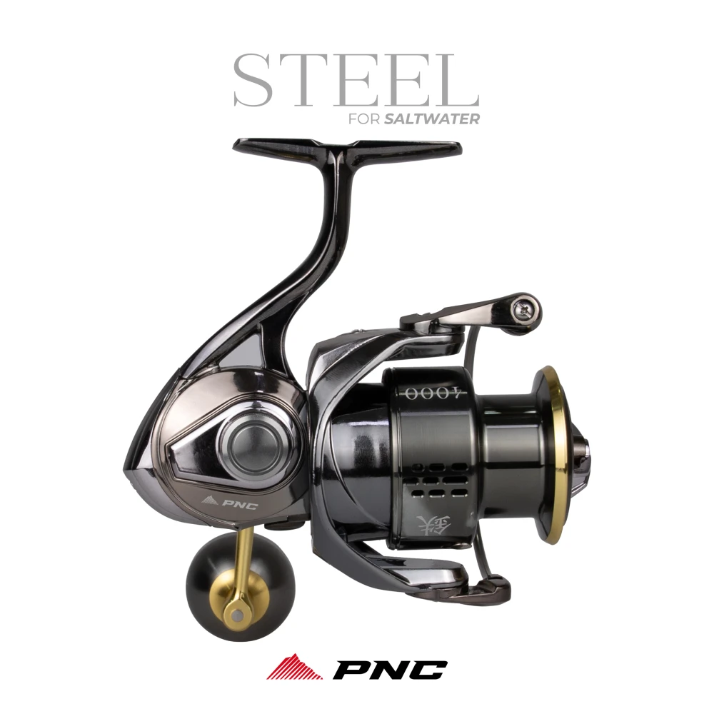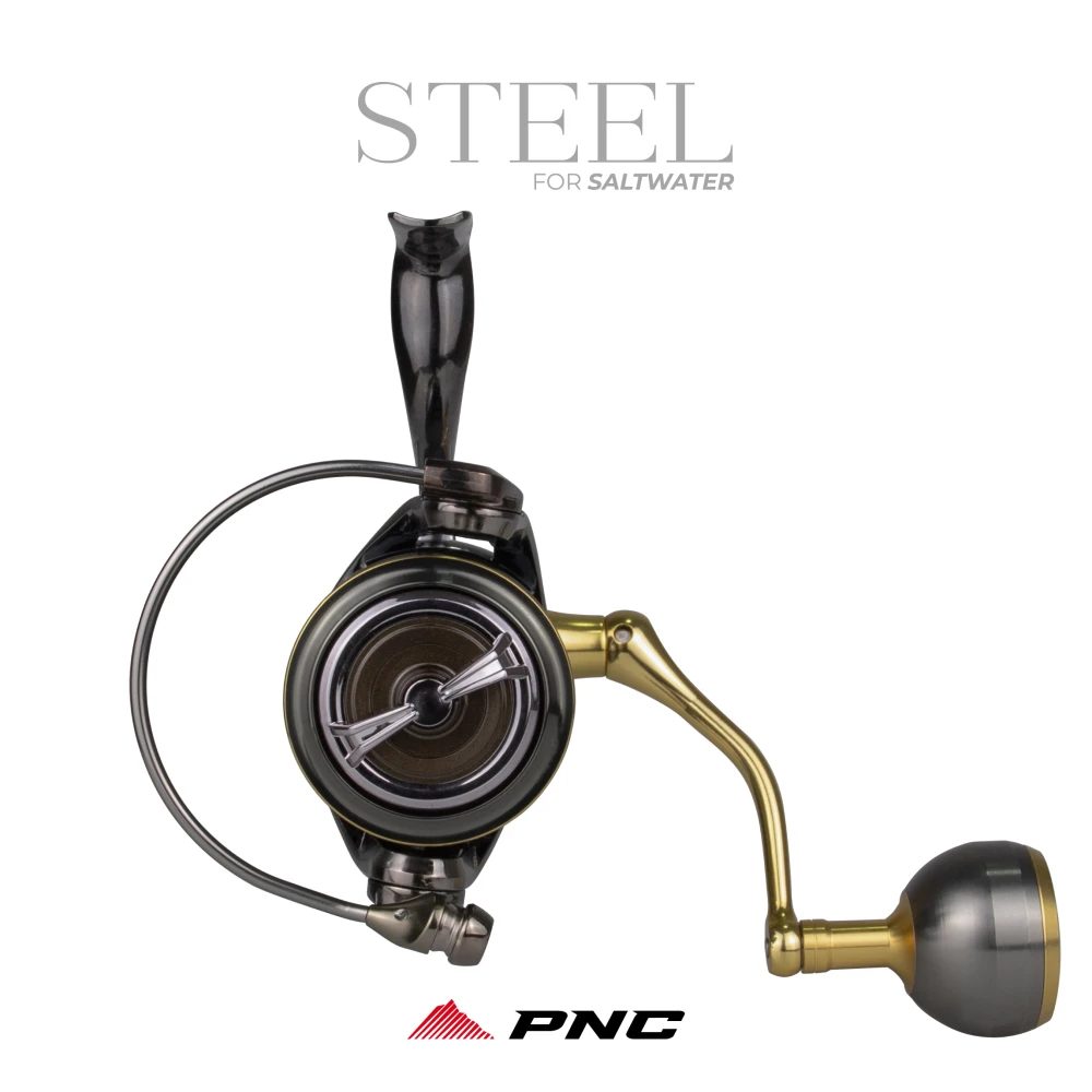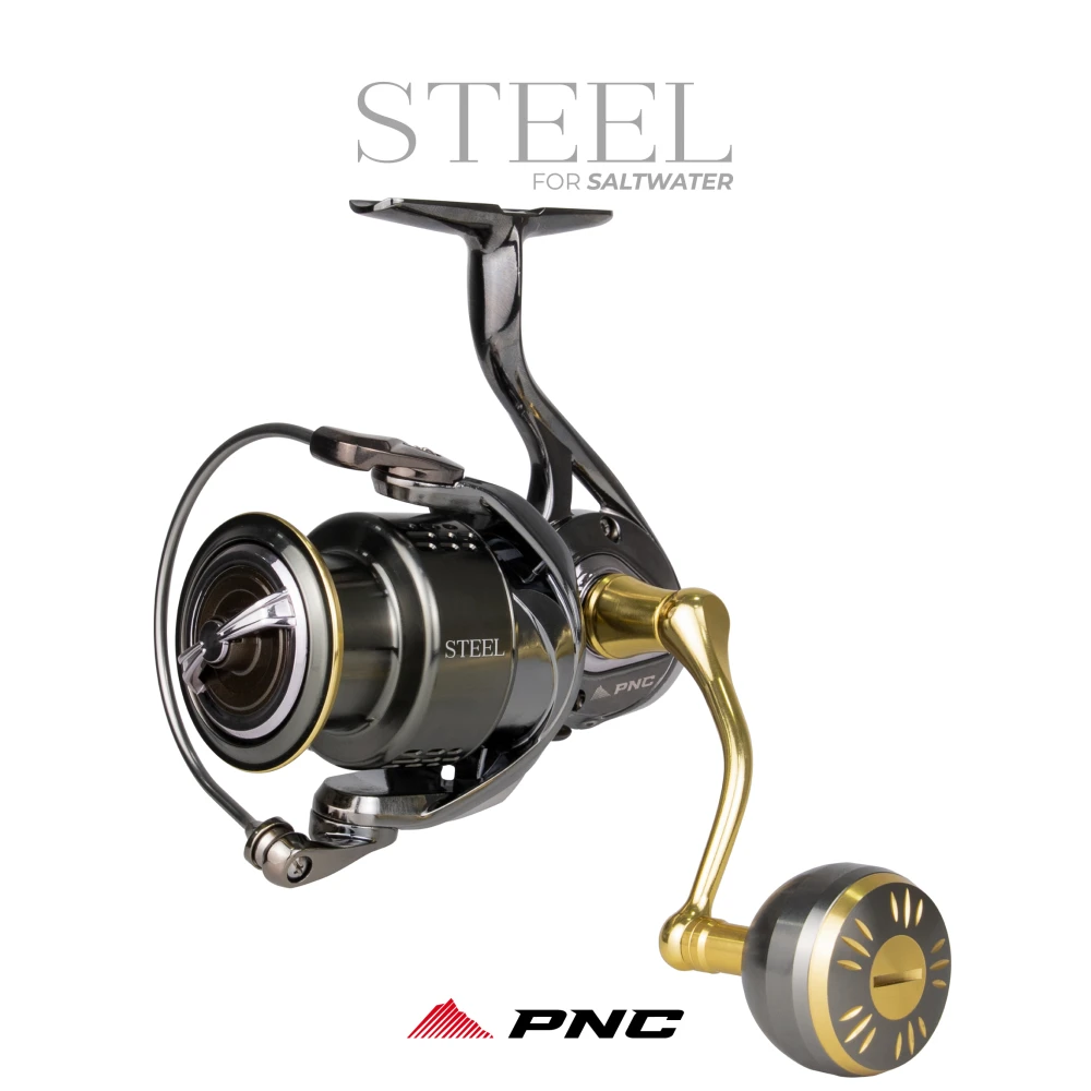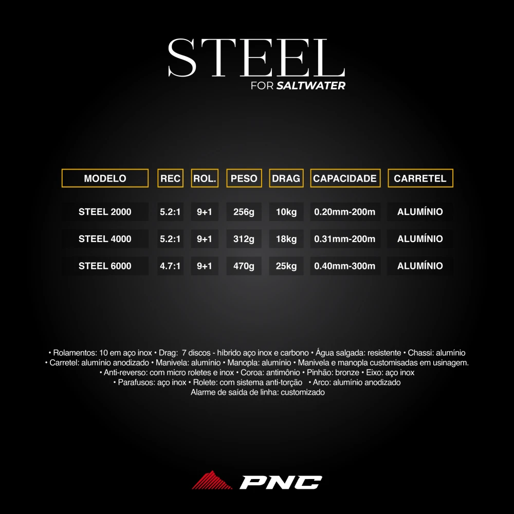 STEEL é um molinete com toda a estrutura em metal - alumínio e aço inox, muito forte e ressitente a água salgada
