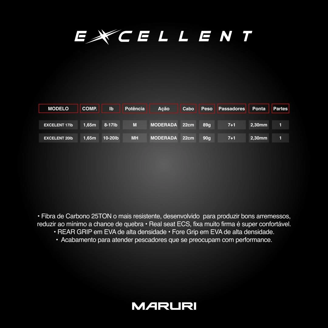 Fibra de Carbono 25TON o mais resistente, desenvolvido para produzir bons arremessos, reduzir ao mínimo a chance de quebra.