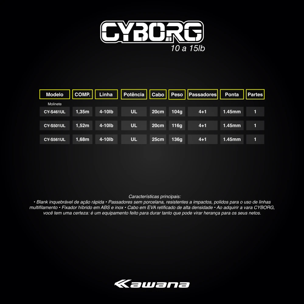 A vara CYBORG da Kawana foi desenvolvida com um objetivo claro: durabilidade acima de tudo. Afinal, nada é mais frustrante do que ter um equipamento falhando no meio da pescaria. Pensando nisso, escolhemos um blank e passadores praticamente indestrutíveis, capazes de enfrentar as condições mais exigentes.