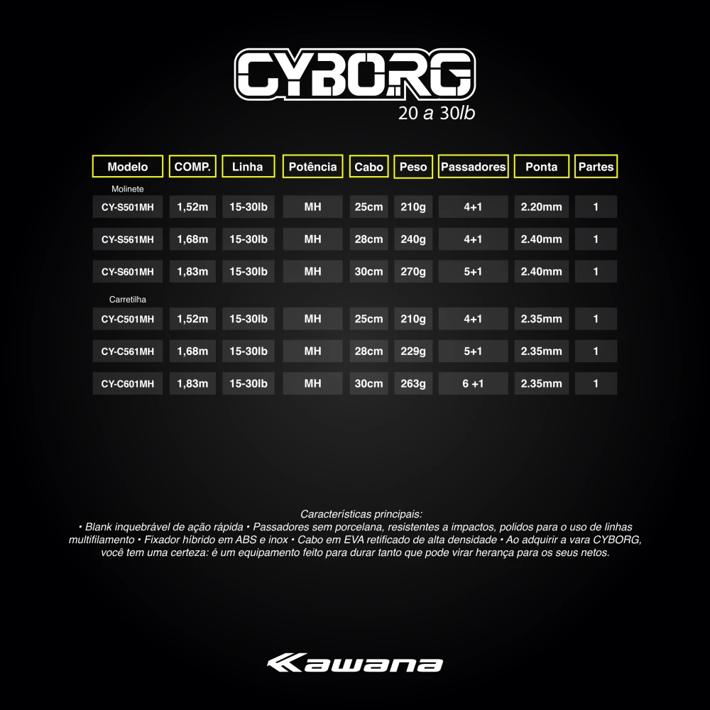 A vara CYBORG da Kawana foi desenvolvida com um objetivo claro: durabilidade acima de tudo. Afinal, nada é mais frustrante do que ter um equipamento falhando no meio da pescaria. Pensando nisso, escolhemos um blank e passadores praticamente indestrutíveis, capazes de enfrentar as condições mais exigentes.